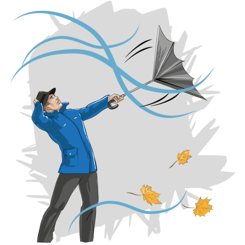 Die Böe weht den Schirm fort.