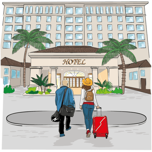 Gebäude mit vielen Räumen, meist mit Schlafzimmer und Bad, in dem Menschen für einen gewissen Zeitraum schlafen können, z.B. wenn sie im Urlaub sind
